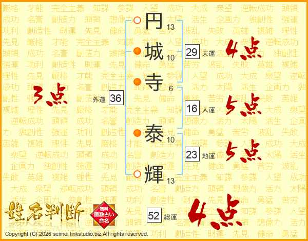 円城寺泰輝さんの総運は52画の4点!