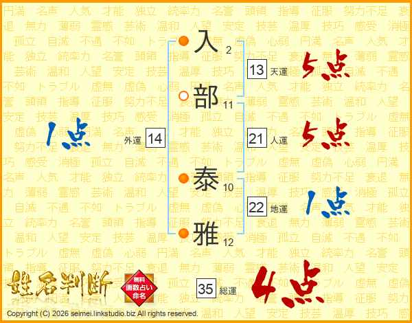 入部泰雅さんの天運は13画の5点!