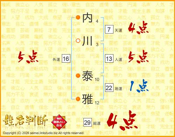 内川泰雅さんの総運は29画の4点!