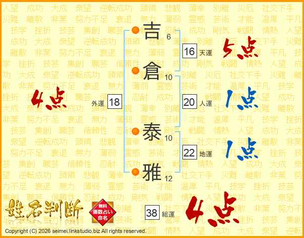 吉倉泰雅さんの総運は38画の4点!