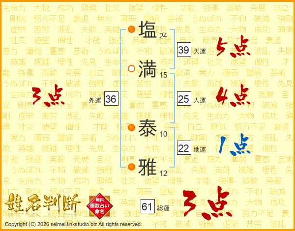 塩(24画)満(15画) 泰(10画)雅(12画)