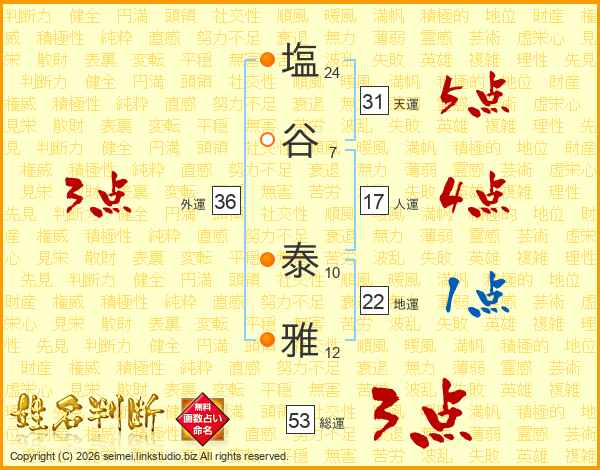 塩谷泰雅さんの総運は53画の3点!