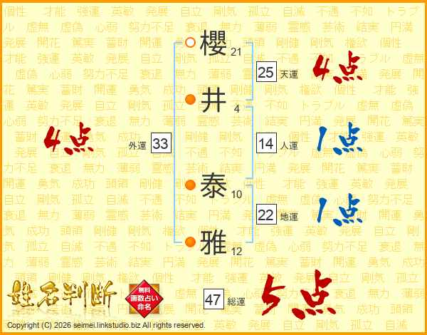 櫻井泰雅さんの総運は47画の5点!