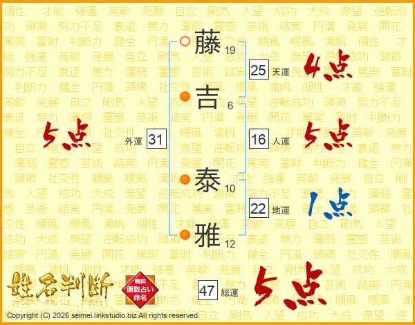 藤吉泰雅さんの総運は47画の5点!