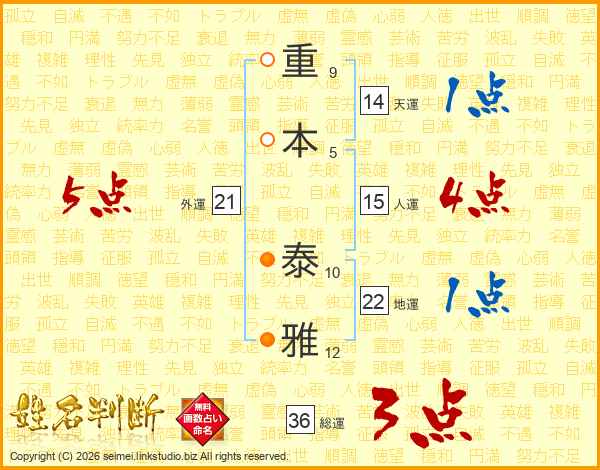 あなたの人生を表す1番重要な運勢です。生涯を通じて影響する総合運となり、主に50歳以降の晩年期に影響を及ぼします。苗字と名前の合計画数。