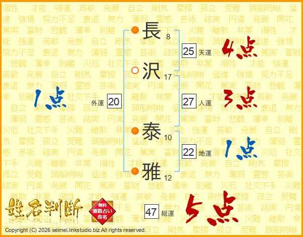 長(8画)沢(17画) 泰(10画)雅(12画)