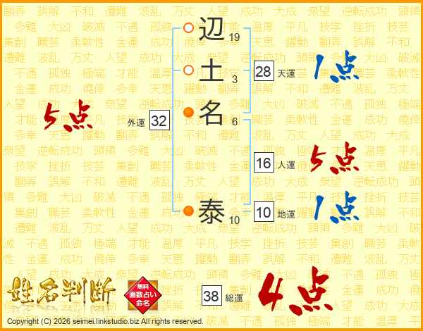 辺土名泰さんの総運は38画の4点!