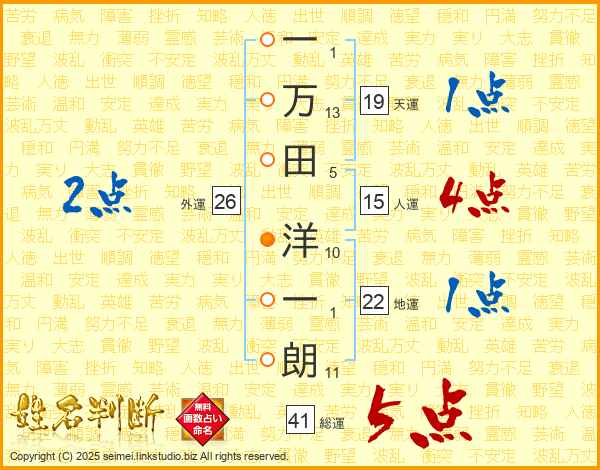 一(1画)万(13画)田(5画) 洋(10画)一(1画)朗(11画)
