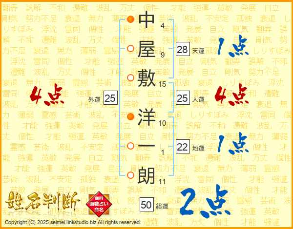 生活面を象徴する運勢です。外部から受ける影響力を表し、結婚運、家庭運や職場、環境への順応性を表します。総運から人運を引いた画数。姓や名が1文字の場合を除く。