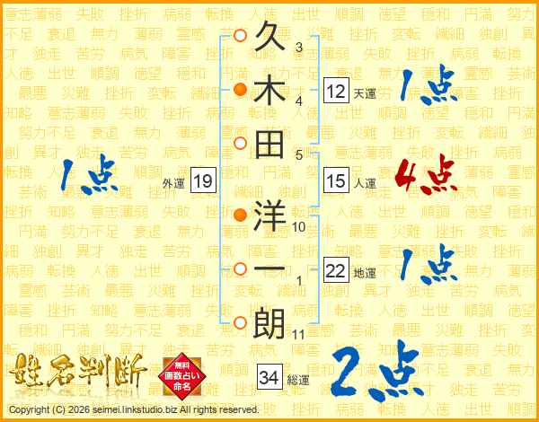 久(3画)木(4画)田(5画) 洋(10画)一(1画)朗(11画)
