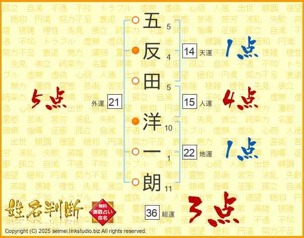 生活面を象徴する運勢です。外部から受ける影響力を表し、結婚運、家庭運や職場、環境への順応性を表します。総運から人運を引いた画数。姓や名が1文字の場合を除く。