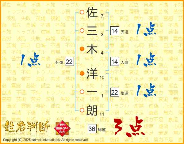 佐(7画)三(3画)木(4画) 洋(10画)一(1画)朗(11画)