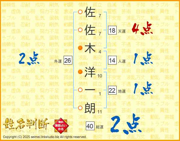 佐(7画)佐(7画)木(4画) 洋(10画)一(1画)朗(11画)