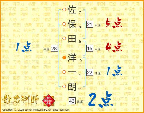 佐(7画)保(9画)田(5画) 洋(10画)一(1画)朗(11画)