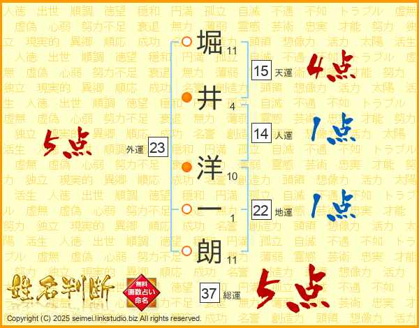 堀(11画)井(4画) 洋(10画)一(1画)朗(11画)