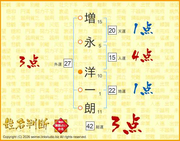 増(15画)永(5画) 洋(10画)一(1画)朗(11画)