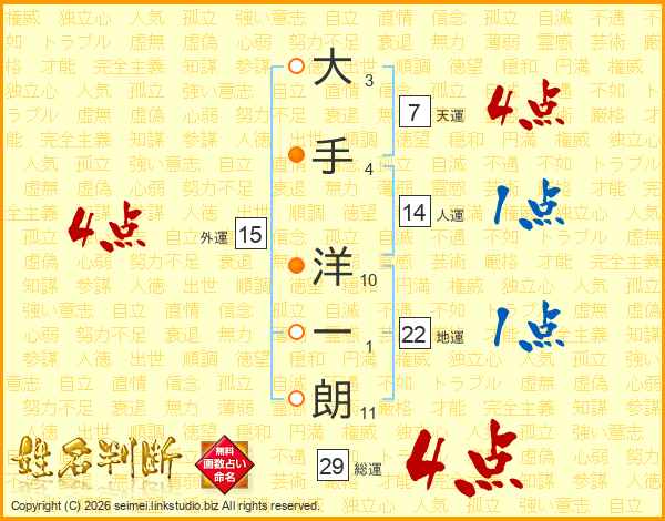 大(3画)手(4画) 洋(10画)一(1画)朗(11画)