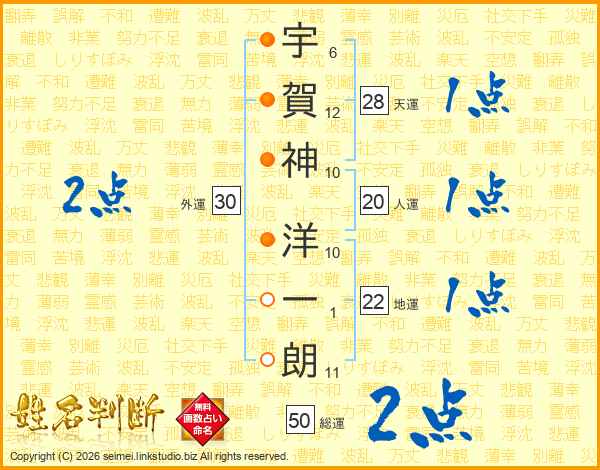 宇(6画)賀(12画)神(10画) 洋(10画)一(1画)朗(11画)