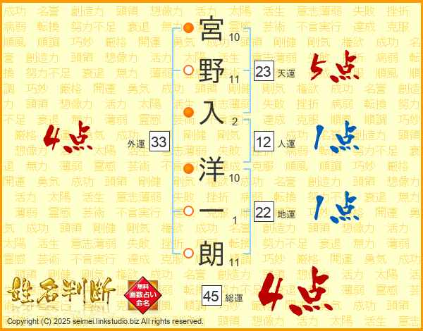 宮(10画)野(11画)入(2画) 洋(10画)一(1画)朗(11画)