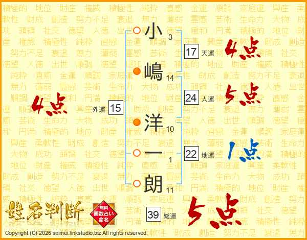 小(3画)嶋(14画) 洋(10画)一(1画)朗(11画)