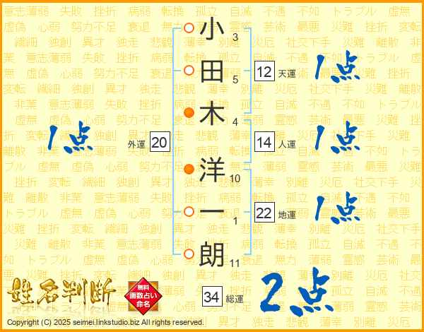生活面を象徴する運勢です。外部から受ける影響力を表し、結婚運、家庭運や職場、環境への順応性を表します。総運から人運を引いた画数。姓や名が1文字の場合を除く。