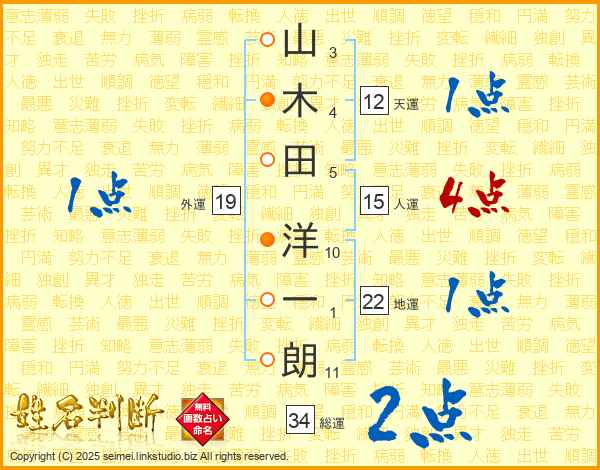 山(3画)木(4画)田(5画) 洋(10画)一(1画)朗(11画)