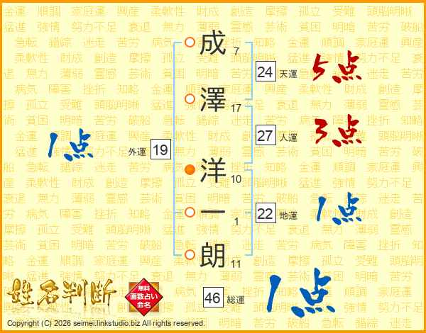 成(7画)澤(17画) 洋(10画)一(1画)朗(11画)