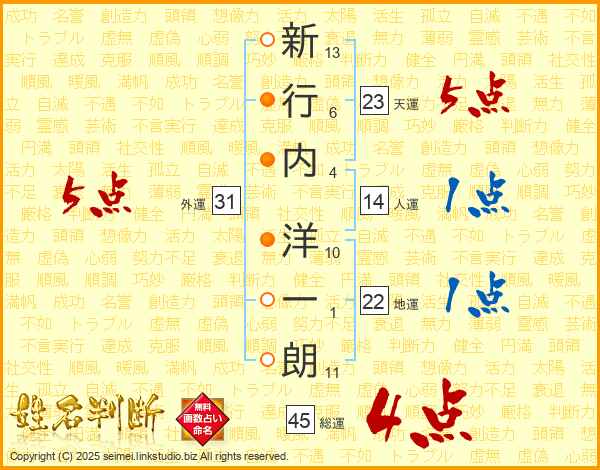 あなたの人生を表す1番重要な運勢です。生涯を通じて影響する総合運となり、主に50歳以降の晩年期に影響を及ぼします。苗字と名前の合計画数。
