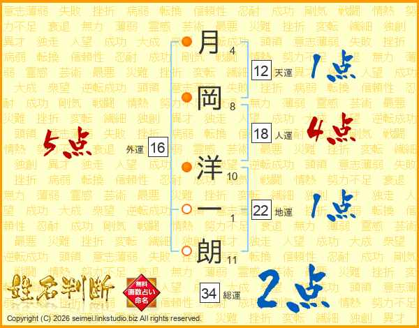 月(4画)岡(8画) 洋(10画)一(1画)朗(11画)