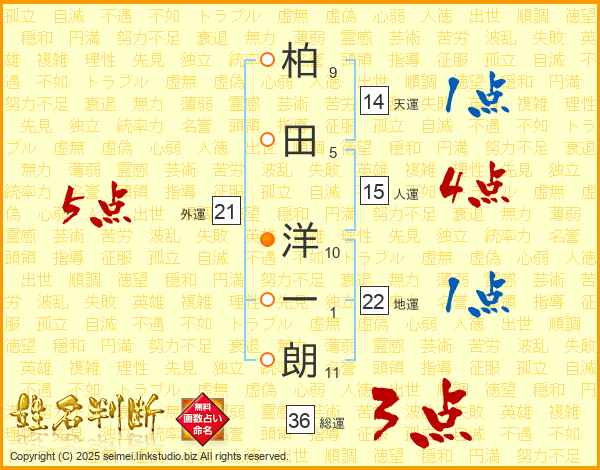柏(9画)田(5画) 洋(10画)一(1画)朗(11画)