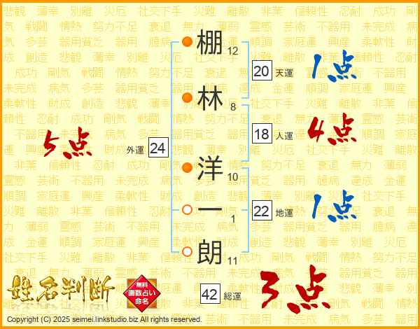 棚(12画)林(8画) 洋(10画)一(1画)朗(11画)