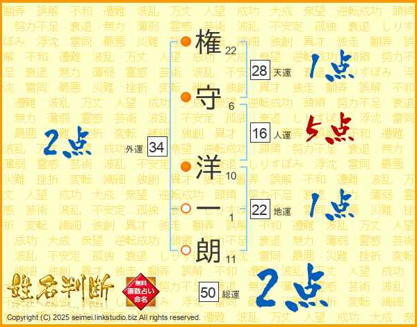 権(22画)守(6画) 洋(10画)一(1画)朗(11画)