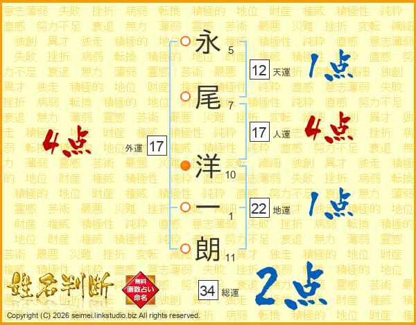 永(5画)尾(7画) 洋(10画)一(1画)朗(11画)