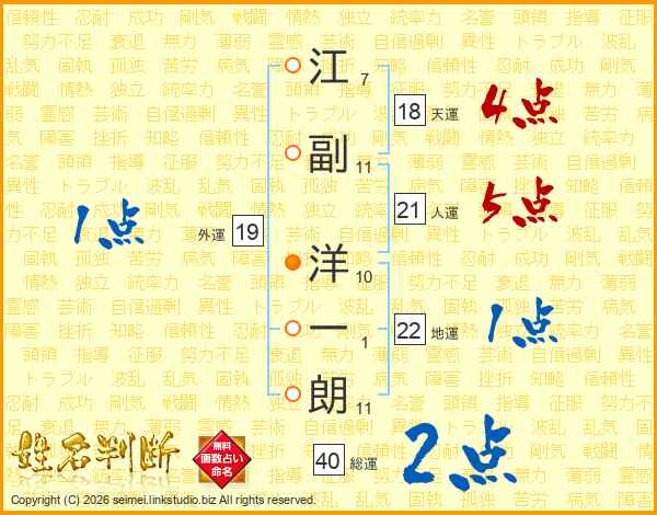 画数の奇数(○陽)と偶数(●陰)の配列で吉凶を占います。どちらかにかたよる名前は大凶名で避ける必要があります。画数の奇数偶数。