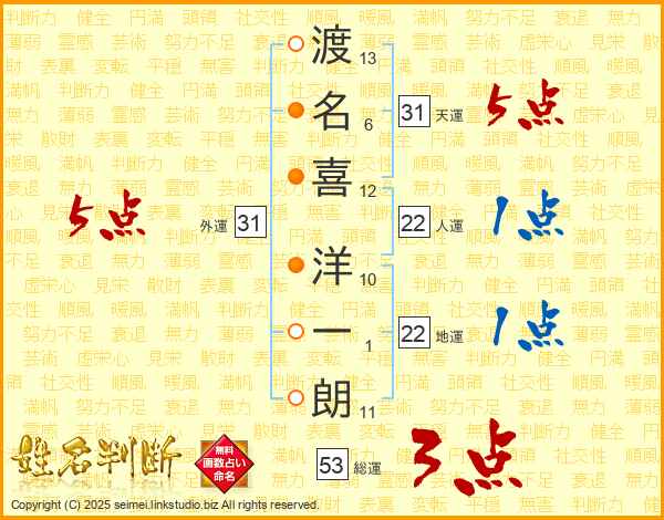 渡(13画)名(6画)喜(12画) 洋(10画)一(1画)朗(11画)