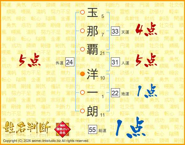 玉(5画)那(7画)覇(21画) 洋(10画)一(1画)朗(11画)