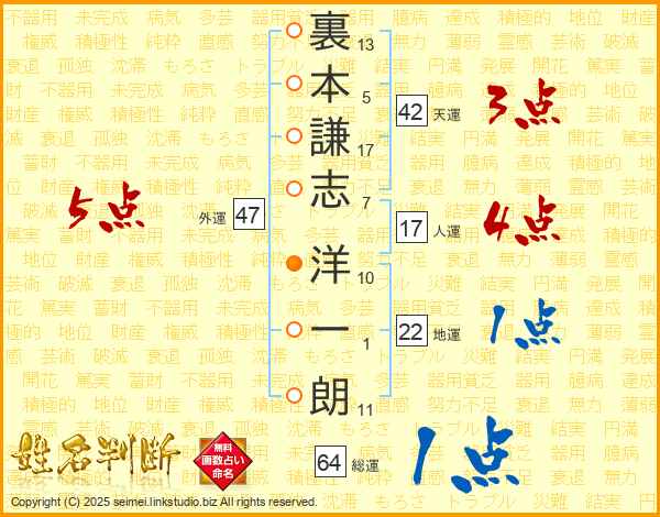 裏(13画)本(5画)謙(17画)志(7画) 洋(10画)一(1画)朗(11画)