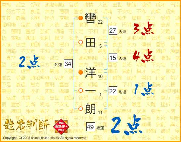 轡(22画)田(5画) 洋(10画)一(1画)朗(11画)