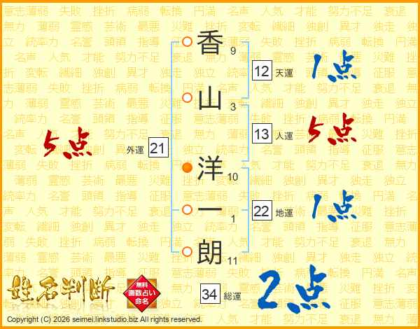 香(9画)山(3画) 洋(10画)一(1画)朗(11画)