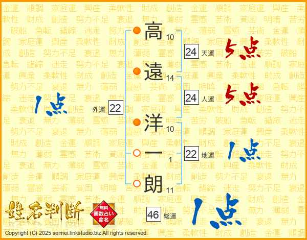 高(10画)遠(14画) 洋(10画)一(1画)朗(11画)