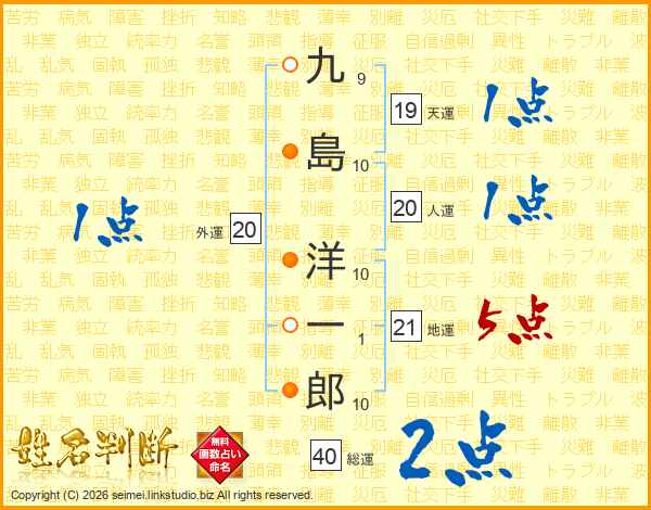 九(9画)島(10画) 洋(10画)一(1画)郎(10画)