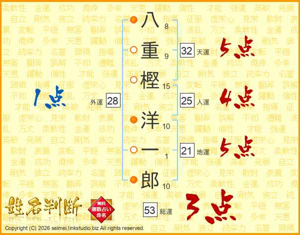 八重樫洋一郎さんの総運は53画の3点!