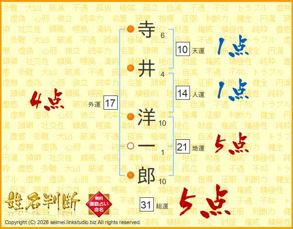 寺井洋一郎さんの総運は31画の5点!