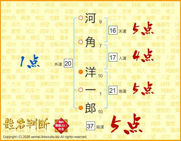 河(9画)角(7画) 洋(10画)一(1画)郎(10画)