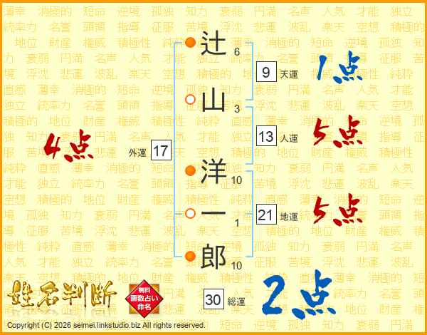 辻(6画)山(3画) 洋(10画)一(1画)郎(10画)