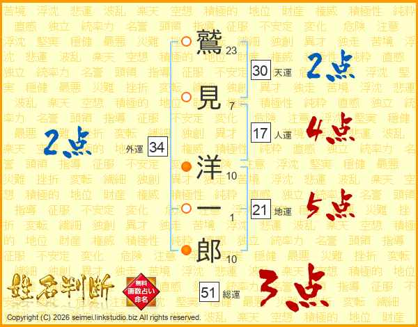 鷲(23画)見(7画) 洋(10画)一(1画)郎(10画)