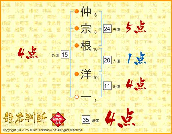 仲(6画)宗(8画)根(10画) 洋(10画)一(1画)