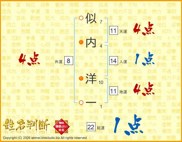 生活面を象徴する運勢です。外部から受ける影響力を表し、結婚運、家庭運や職場、環境への順応性を表します。総運から人運を引いた画数。姓や名が1文字の場合を除く。