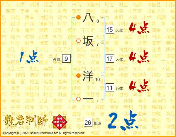 生活面を象徴する運勢です。外部から受ける影響力を表し、結婚運、家庭運や職場、環境への順応性を表します。総運から人運を引いた画数。姓や名が1文字の場合を除く。