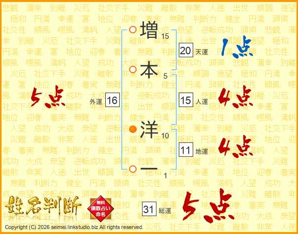 生活面を象徴する運勢です。外部から受ける影響力を表し、結婚運、家庭運や職場、環境への順応性を表します。総運から人運を引いた画数。姓や名が1文字の場合を除く。